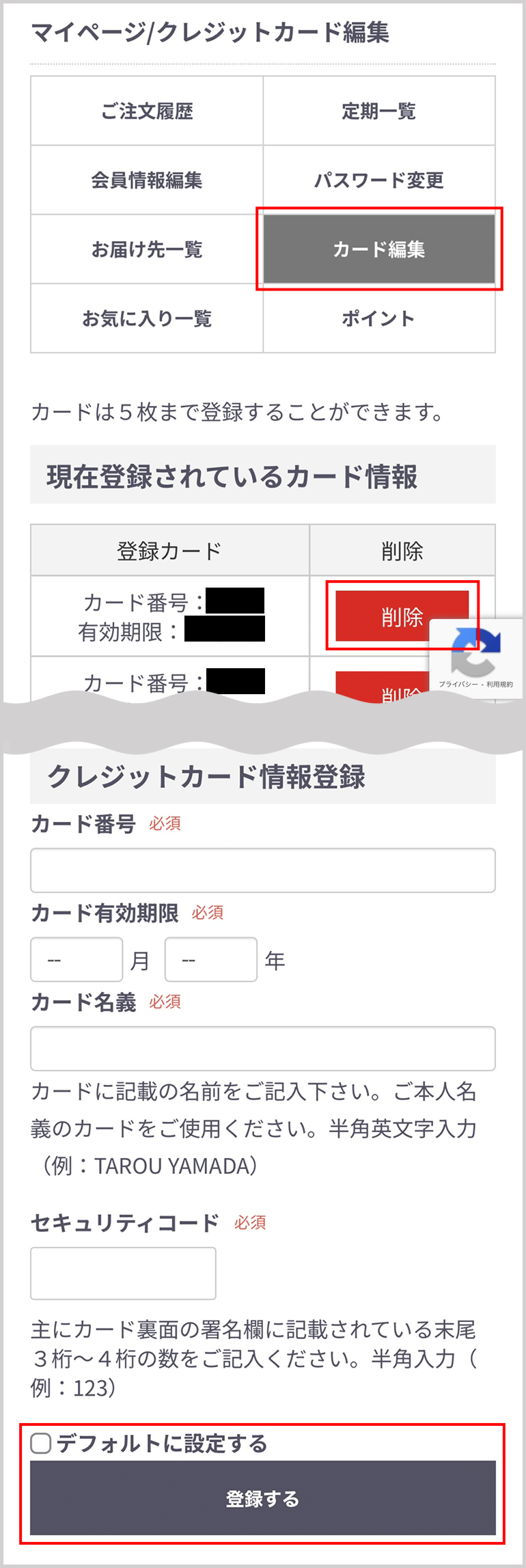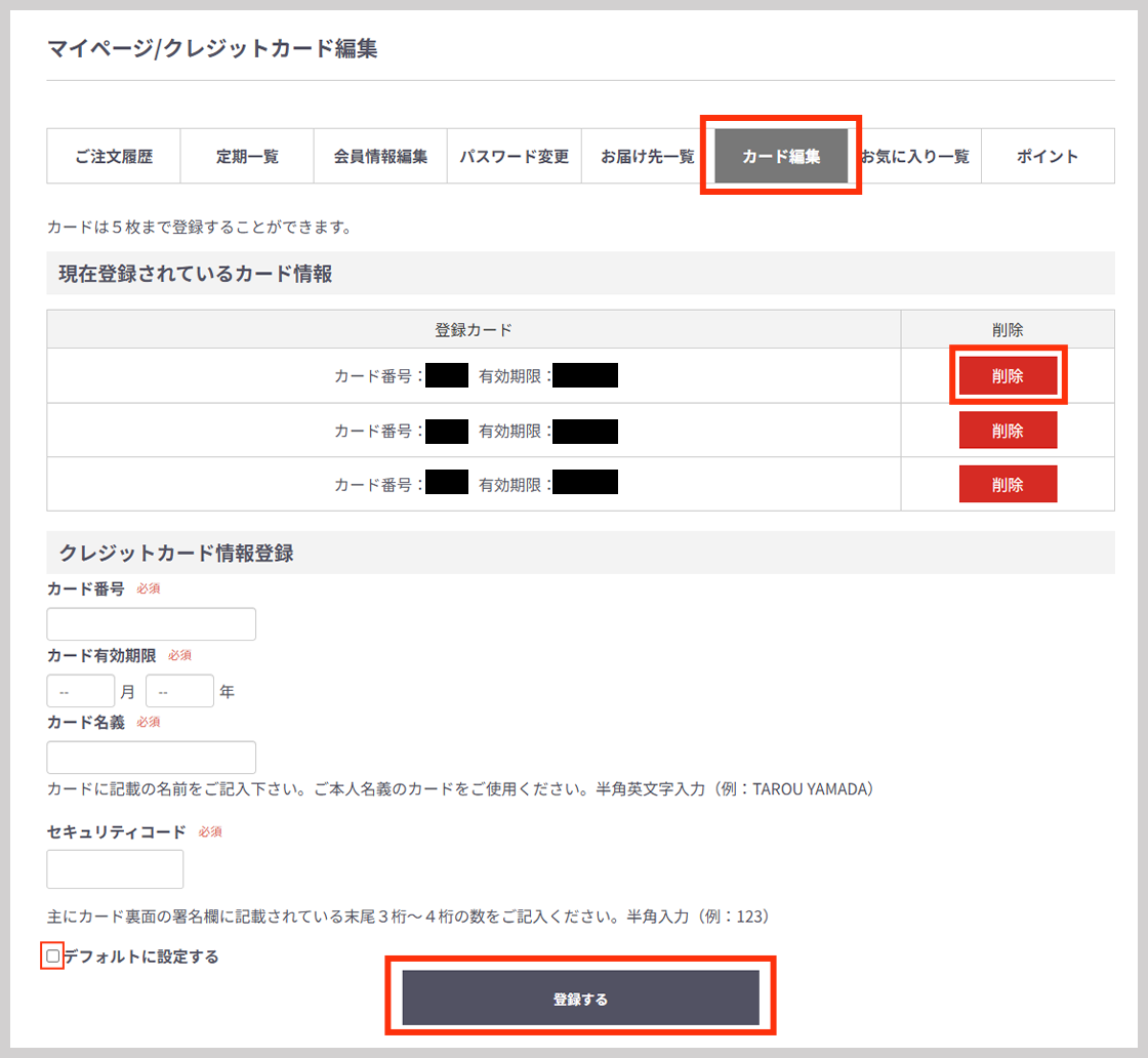・使用しないカード情報を削除したい場合は、「削除」をクリックする。