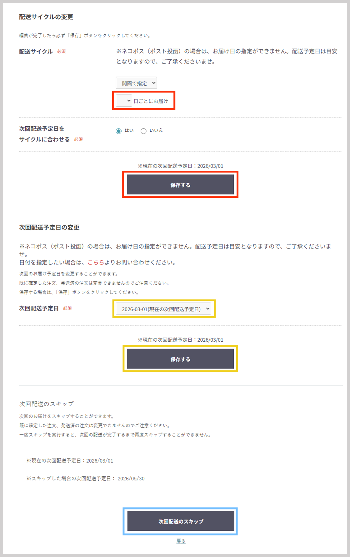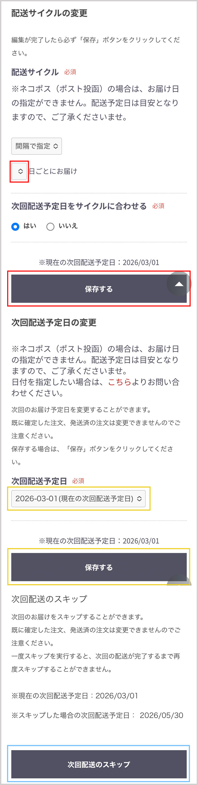 【配送予定日変更の場合】次回配送予定日の変更の項目から、次回配送予定日よりプルダウンで日時を選択して、「保存する」をクリックする。(黄色枠内)