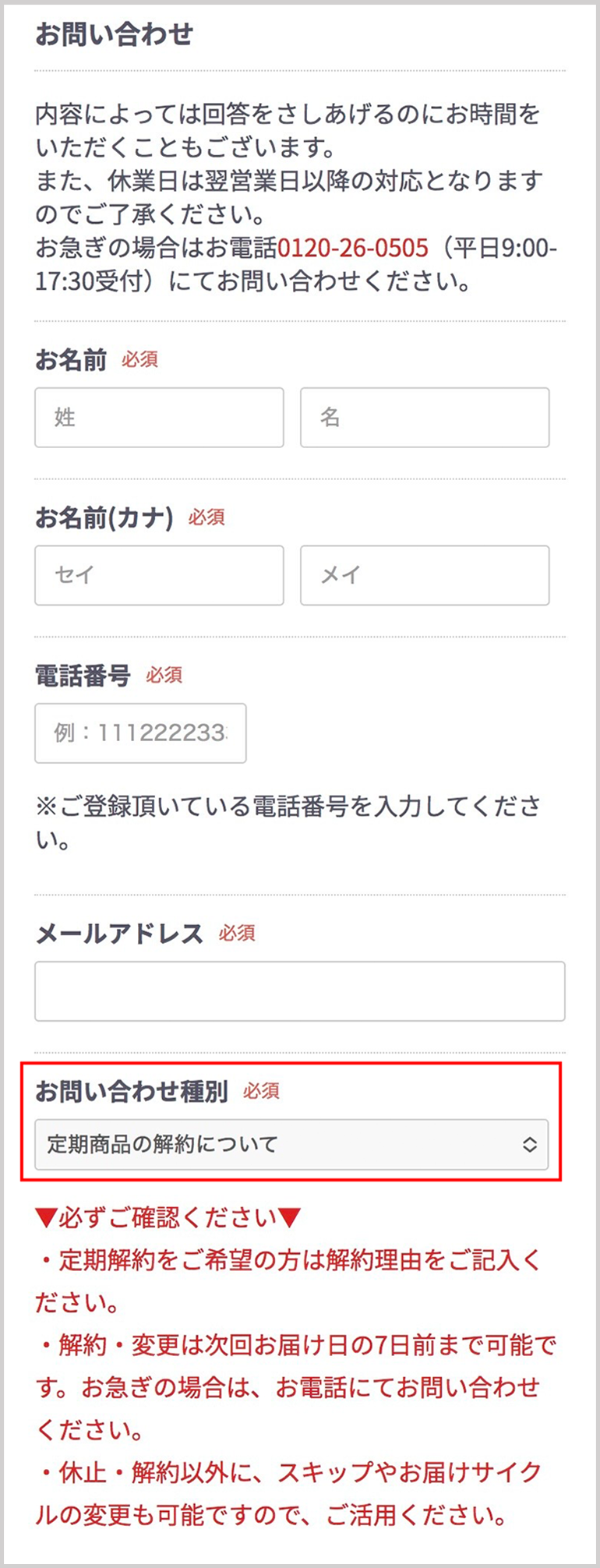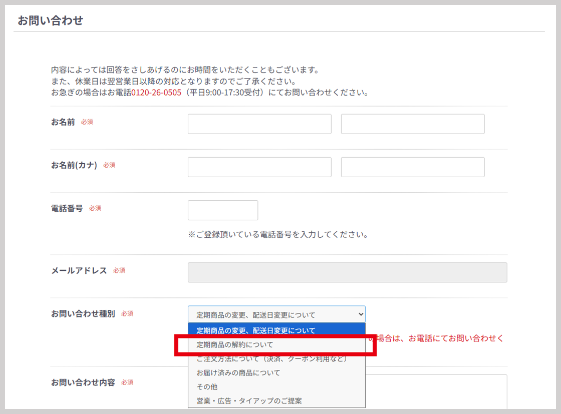 ②必須項目を入力する。※お問い合わせ種別のプルダウンから「定期商品の解約について」を選択。
