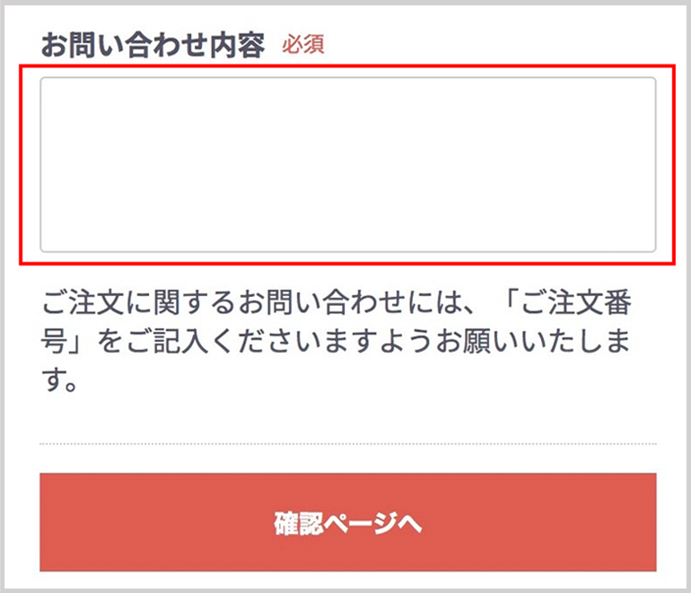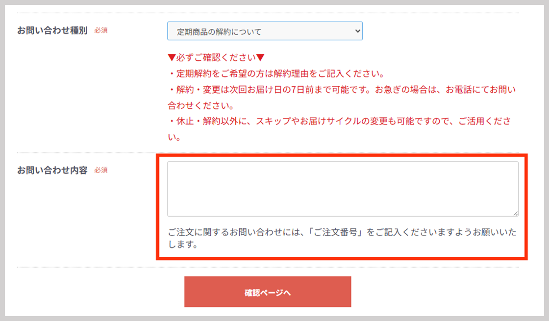 ③解約理由を「お問い合わせ内容」に記入し、「確認ページへ」ボタンを押す。