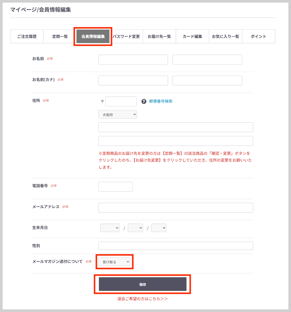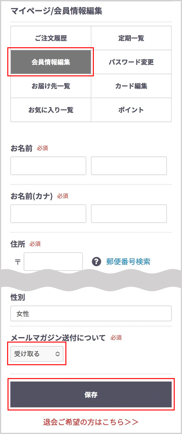 メールマガジンを停止したい場合は、赤枠内の「メールマガジン送付について」の項目の箇所のプルダウンを「受け取らない」を選択してください。
