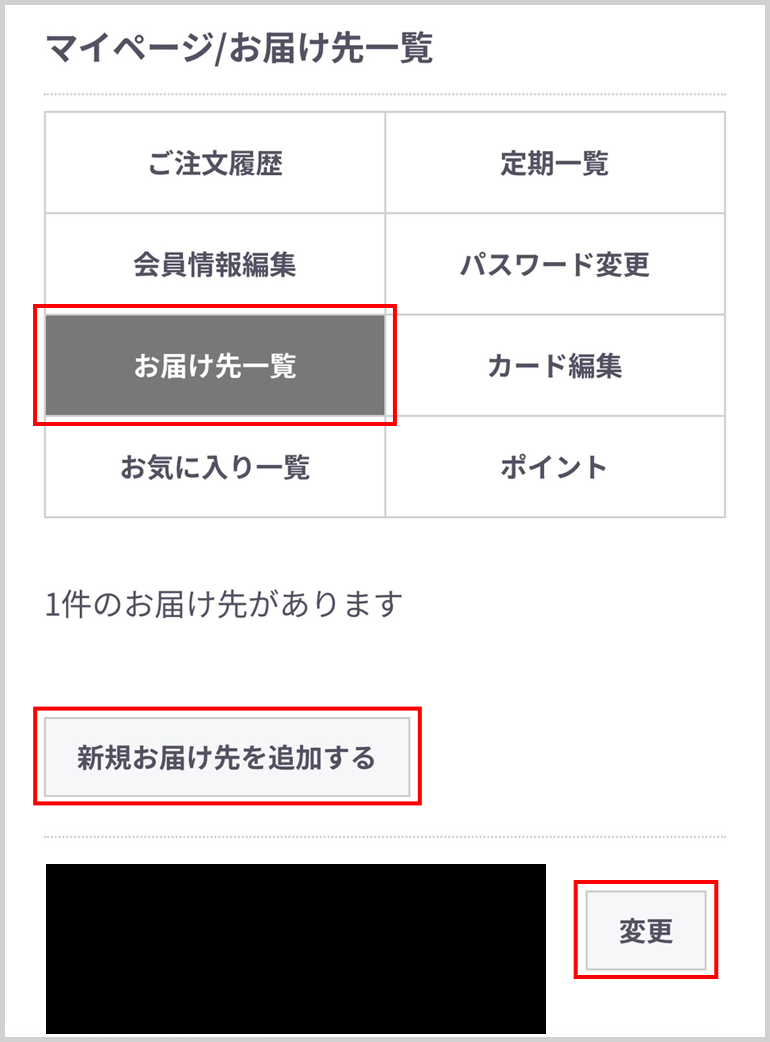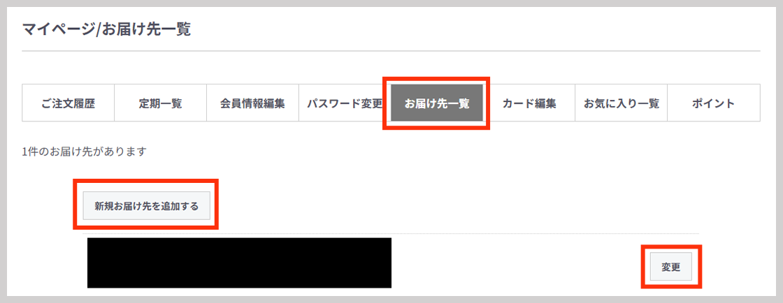 ②「お届け先一覧」>「変更」または、「新規お届け先を追加する」をクリックする。