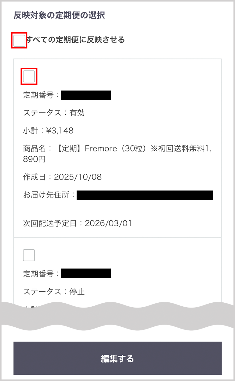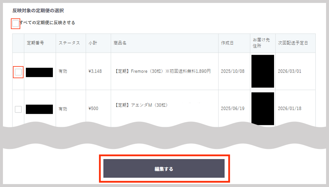 ※複数の注文がある場合は、すべての定期便に反映させるにチェック、もしくは、該当の注文を選択して「編集する」をクリックしてください。