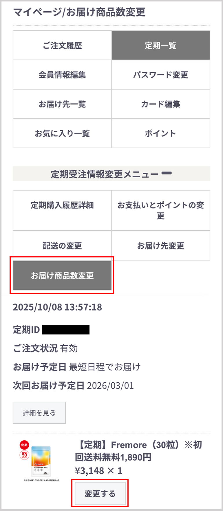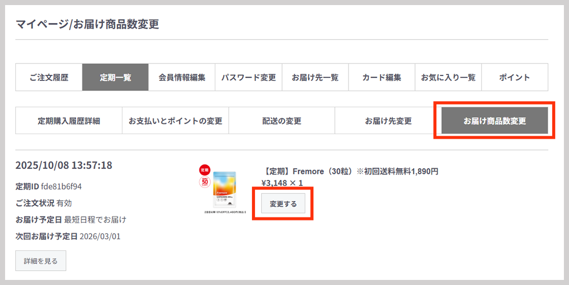 - ・お届け日の7日前を過ぎた定期商品について変更をしたい場合