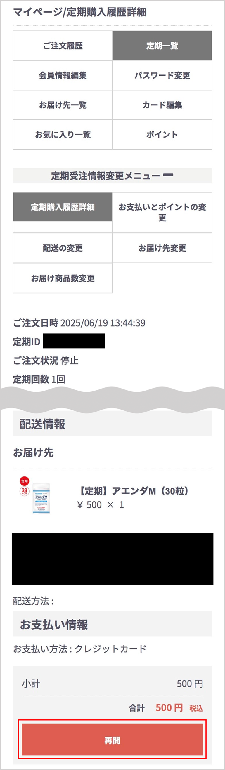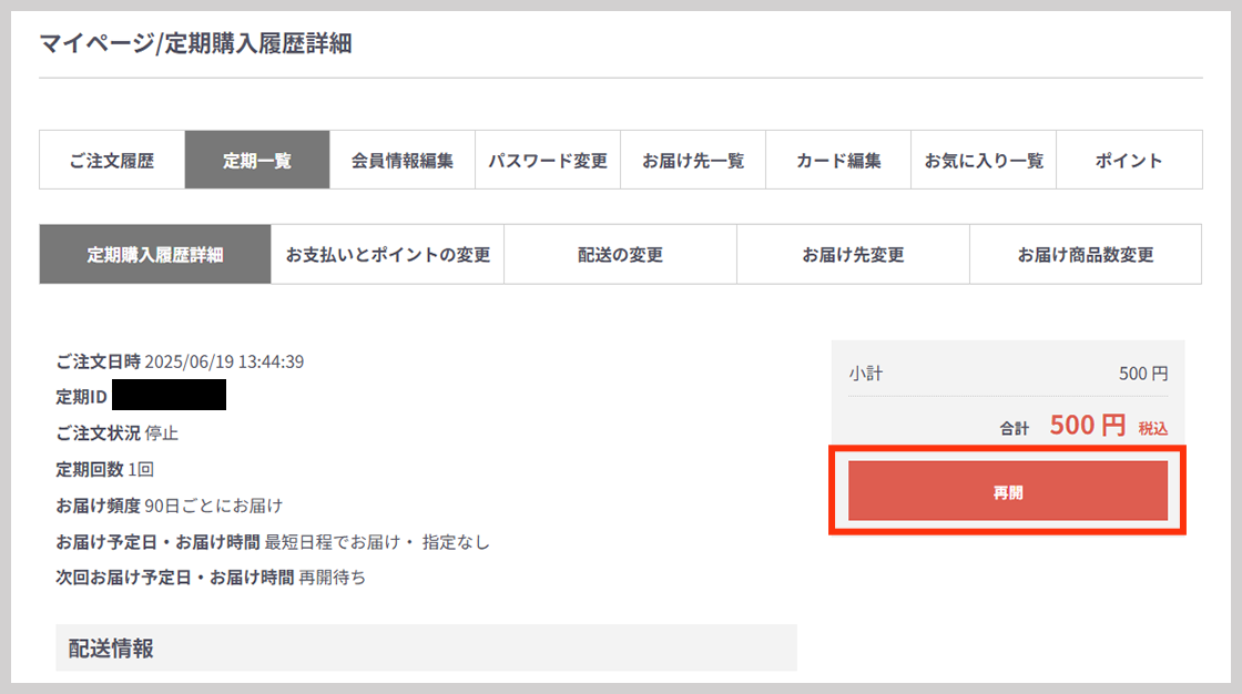 ③次回配送予定日を設定し、「定期便を再開」をクリックする。