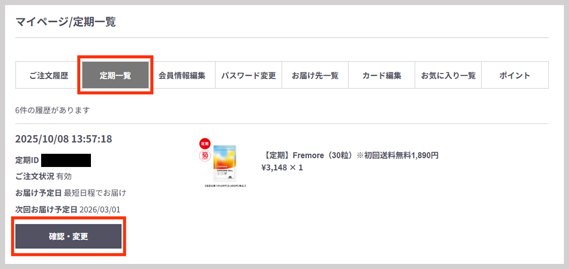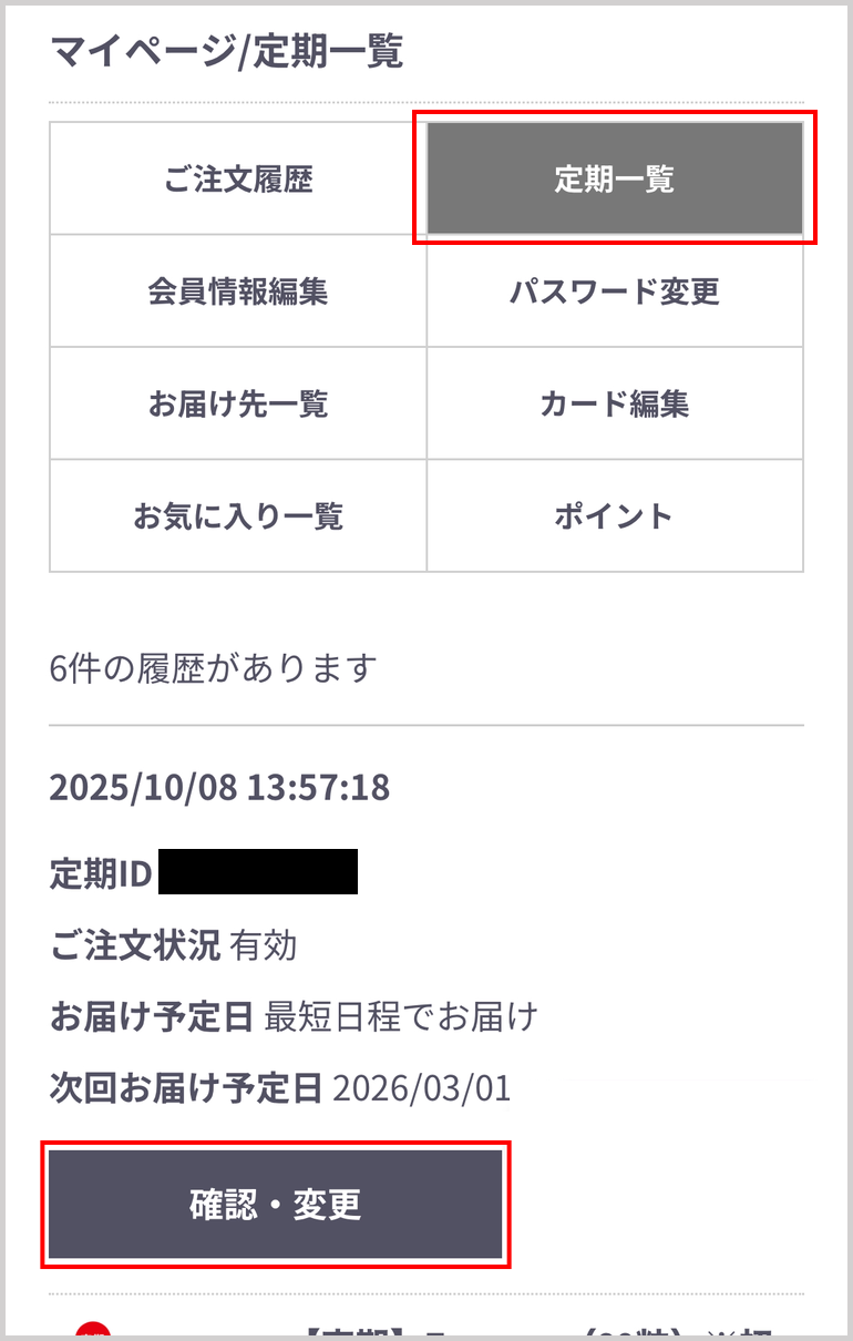 ①マイページにログインし、「定期一覧」>「確認・変更」をクリックする。